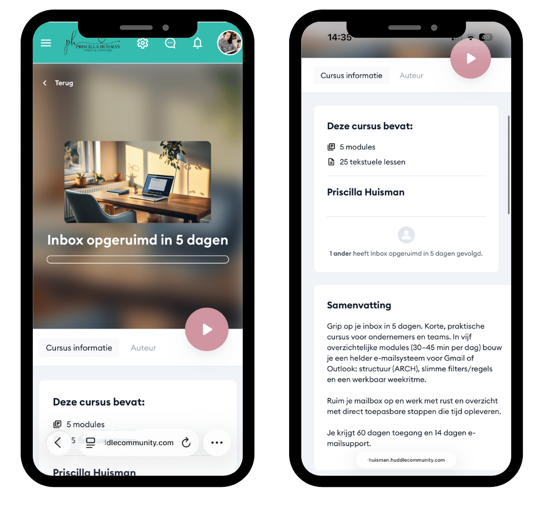 Ik richt tools in als Huddle, Plug&Pay, MailBlue, Mailchimp en Buffer en beheer ze, zodat academy, betalingen, e-mail en posts lopen zonder gedoe. Zelf aan de slag? Volg de cursus Inbox opgeruimd in 5 dagen.
